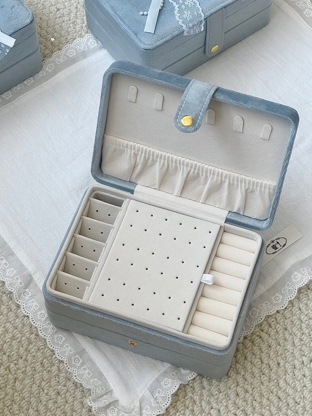 This elegant double-layer jewelry box combines a delicate lace bow design with luxurious haze blue velvet exterior, offering sophisticated storage for your precious jewelry collection. The spacious interior with soft velvet lining provides secure protection for your necklaces, rings, and earrings while adding a touch of romantic elegance to your dressing table.