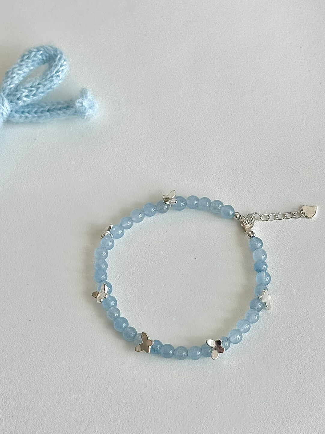 "프로스트윙 버터플라이" 아쿠아마린 팔찌로 겨울의 고요한 속삭임을 느껴보세요. 이 매혹적인 작품은 부드러운 아이스 블루 색상의 천연 아쿠아마린 비즈를 엮어 만들어졌으며, 각 비즈는 얼어붙은 물방울의 정수를 담아냅니다. 마치 수정처럼 맑은 시냇물에 내려앉은 듯 섬세한 S925 스털링 실버 버터플라이 참이 우아하게 장식되어 있습니다. 자연의 아름다움과 세련된 예술성이 완벽하게 어우러진 이 팔찌는 당신의 일상에 얼음처럼 차가운 우아함을 더합니다.