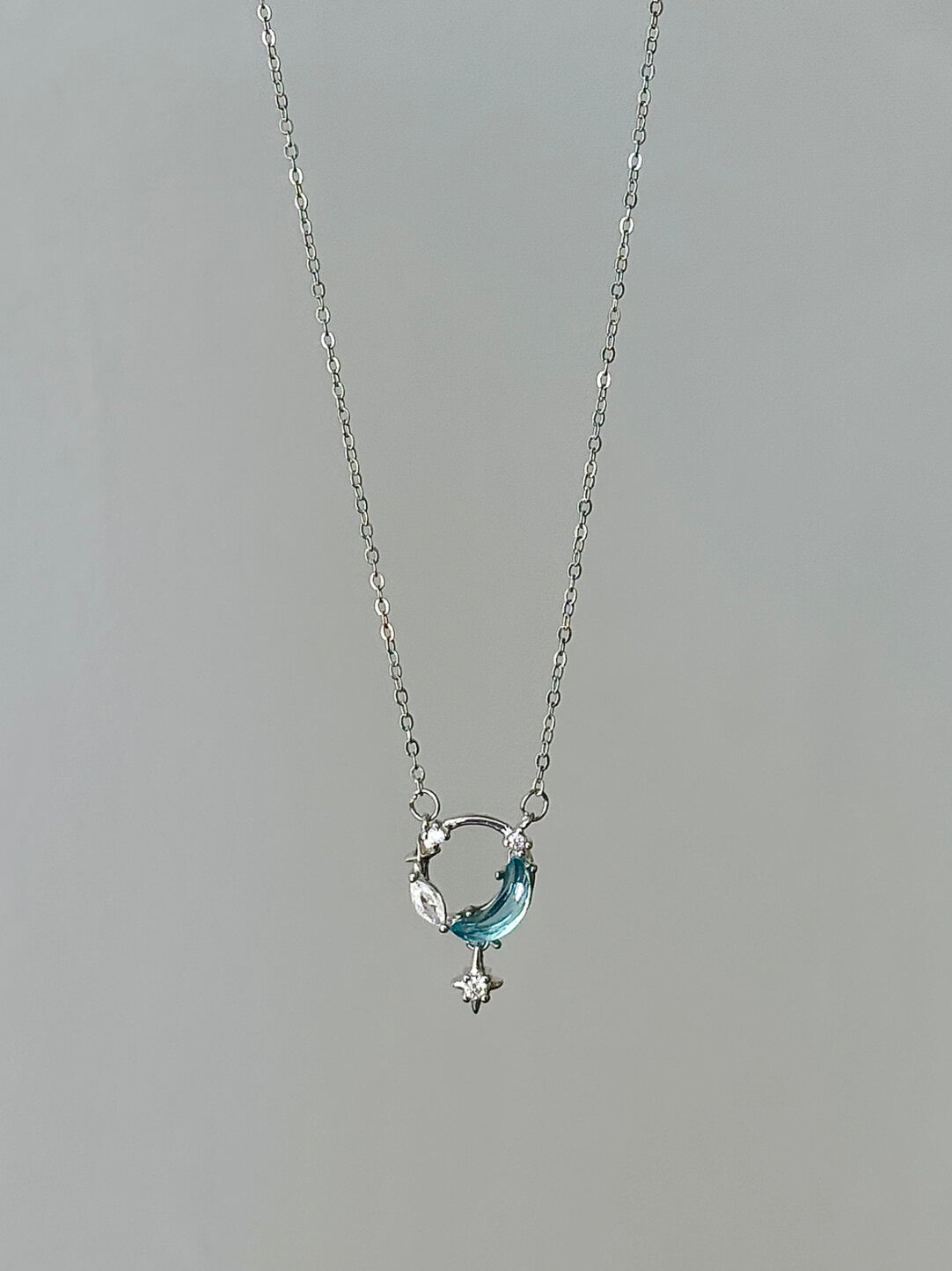 LolaWhite "Frozen Moon Lake" S925 스털링 실버 아쿠아마린 별 & 달 펜던트 목걸이 - 얼음처럼 차갑고 신비로운