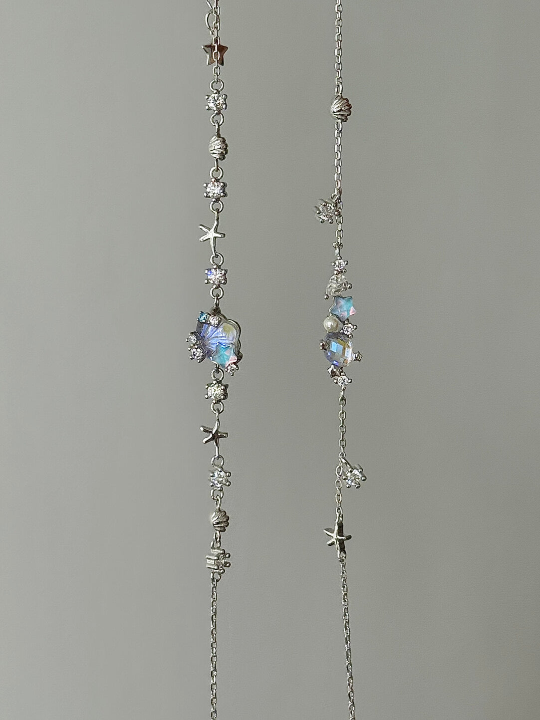 This "Moonlight Coast" jewelry set captures the magical glow of moonlit shores with its iridescent starfish and shell designs, crafted from solid S925 sterling silver. The pieces reflect a soft, dreamy shimmer reminiscent of ocean waves under moonlight, blending marine elegance with minimalist artistry. Perfect for creating a cohesive and enchanting look, the set embodies a serene coastal aesthetic that transitions effortlessly from daytime freshness to evening sophistication.